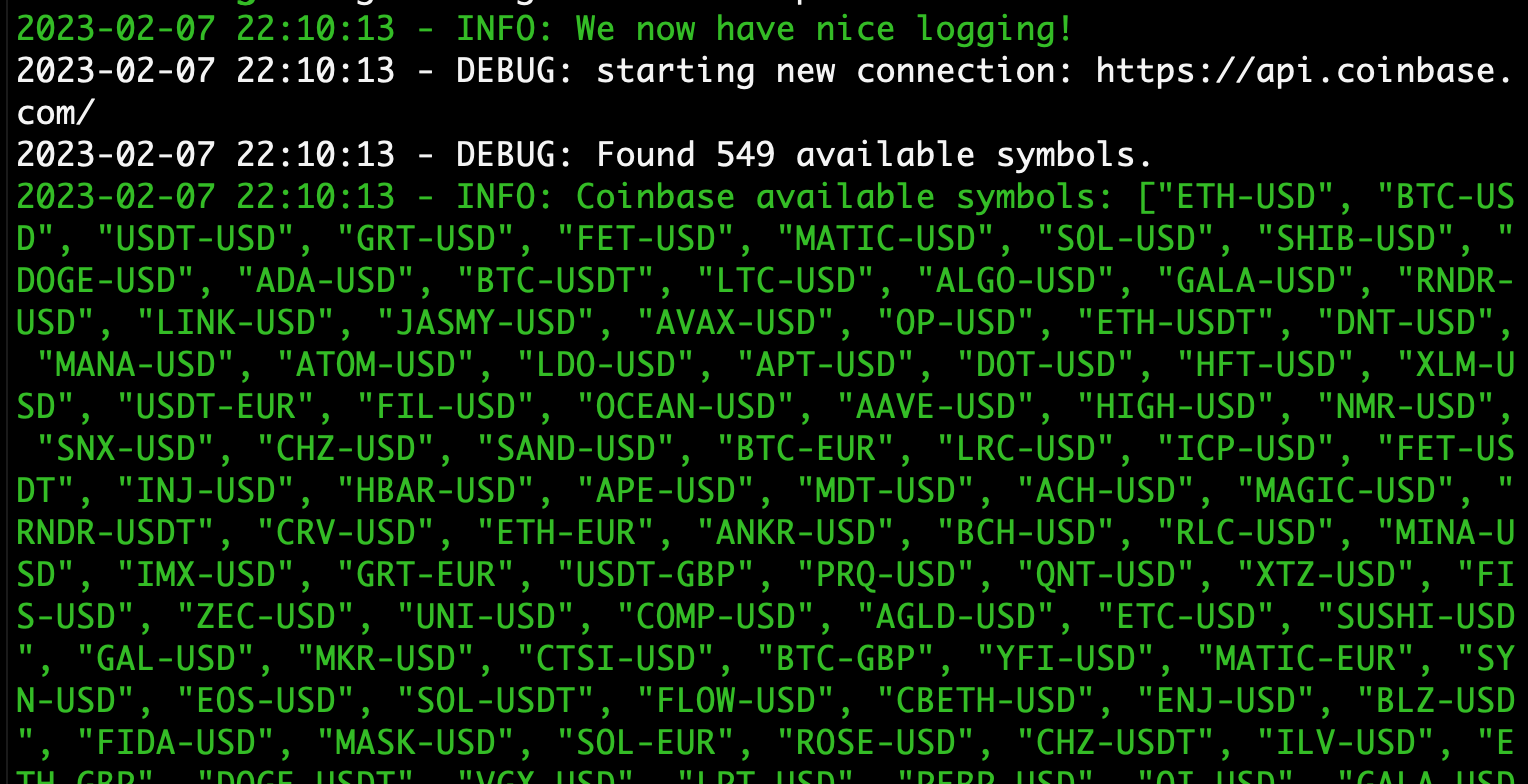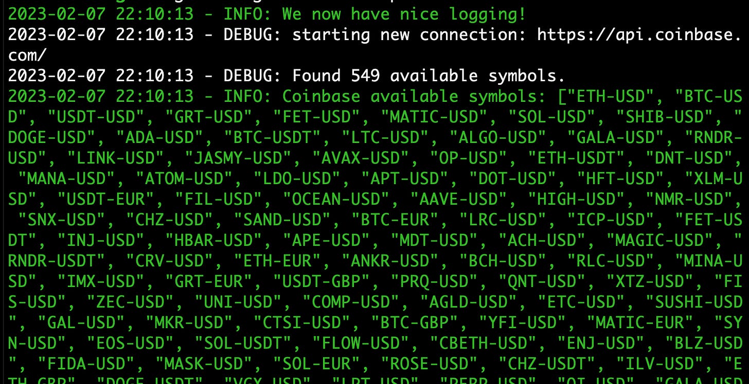 Setting up the REST client was rather simple and leagues faster than my previous Python implementation. I was overcome with joy seeing the DEBUG: Found 549 available symbol. for the first time.