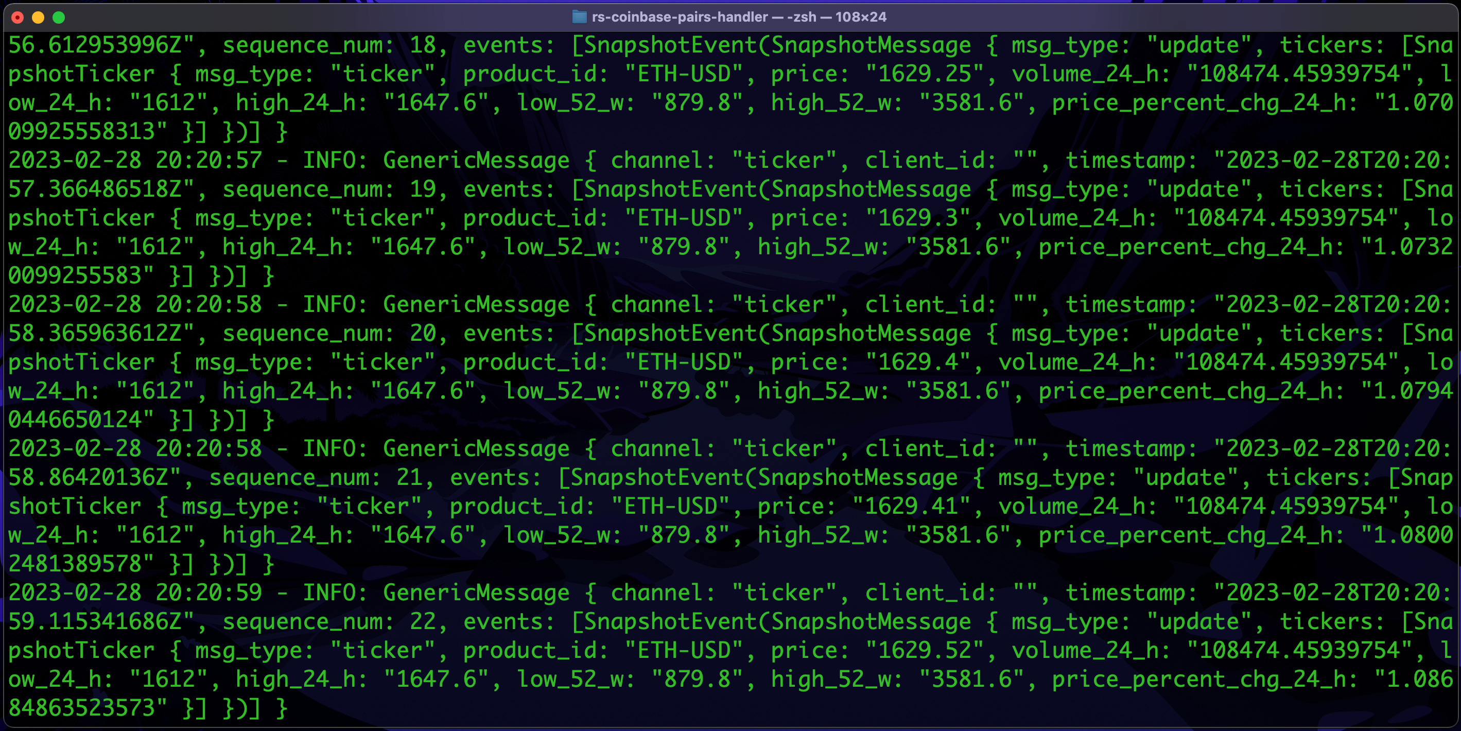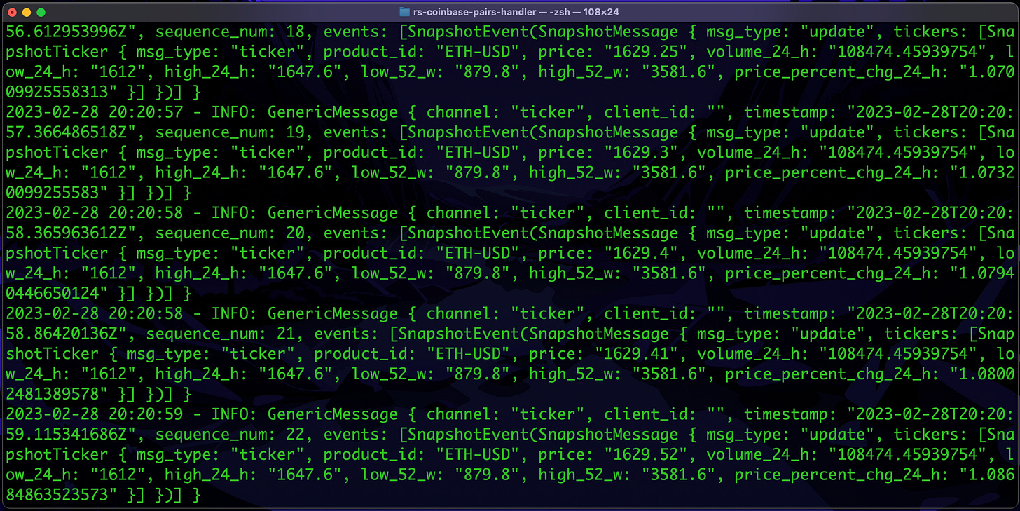 Next was the more difficult part. Building out a whole WebSocket client and Advanced Trade Websocket client. I had to get comfortable with WebSockets, error handling, serialization/deserialization, connections, async, and thread safety. In other words, it was a big bite. The keen eye might see there is a three-week delta between the screenshot above and below.